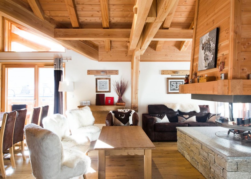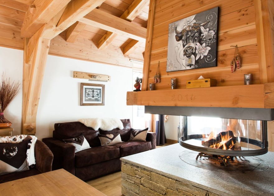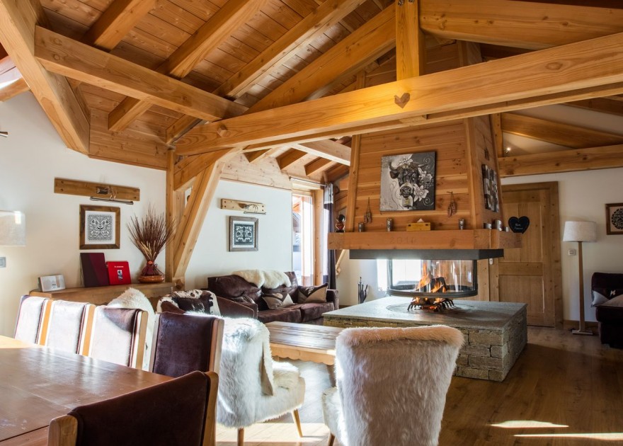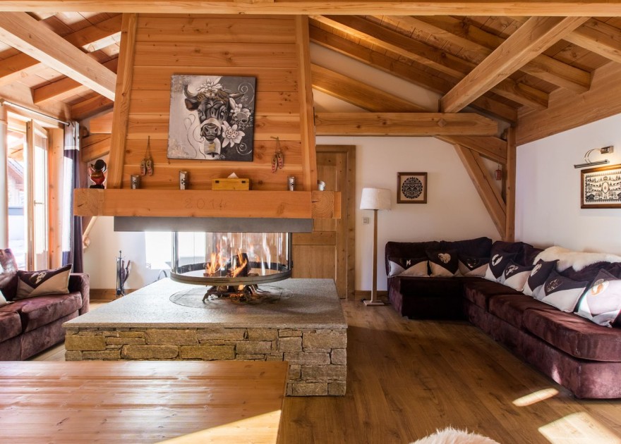 Le + du chalet : Le salon loft de 50 m² avec une magnifique cheminée centrale !