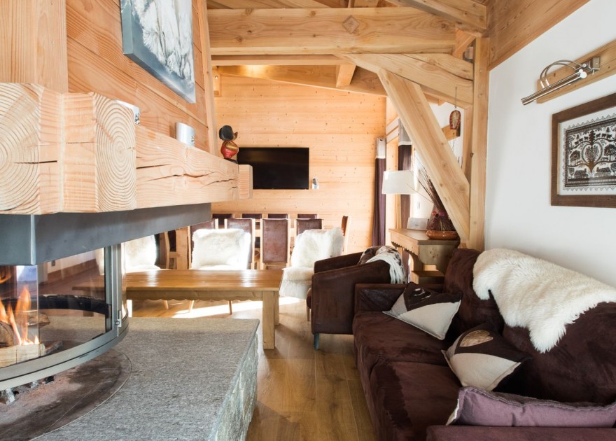 Avec sa vue sur les montagnes de Praz‑sur‑Arly et sa grande cheminée, notre salon vous invite à la relaxation...